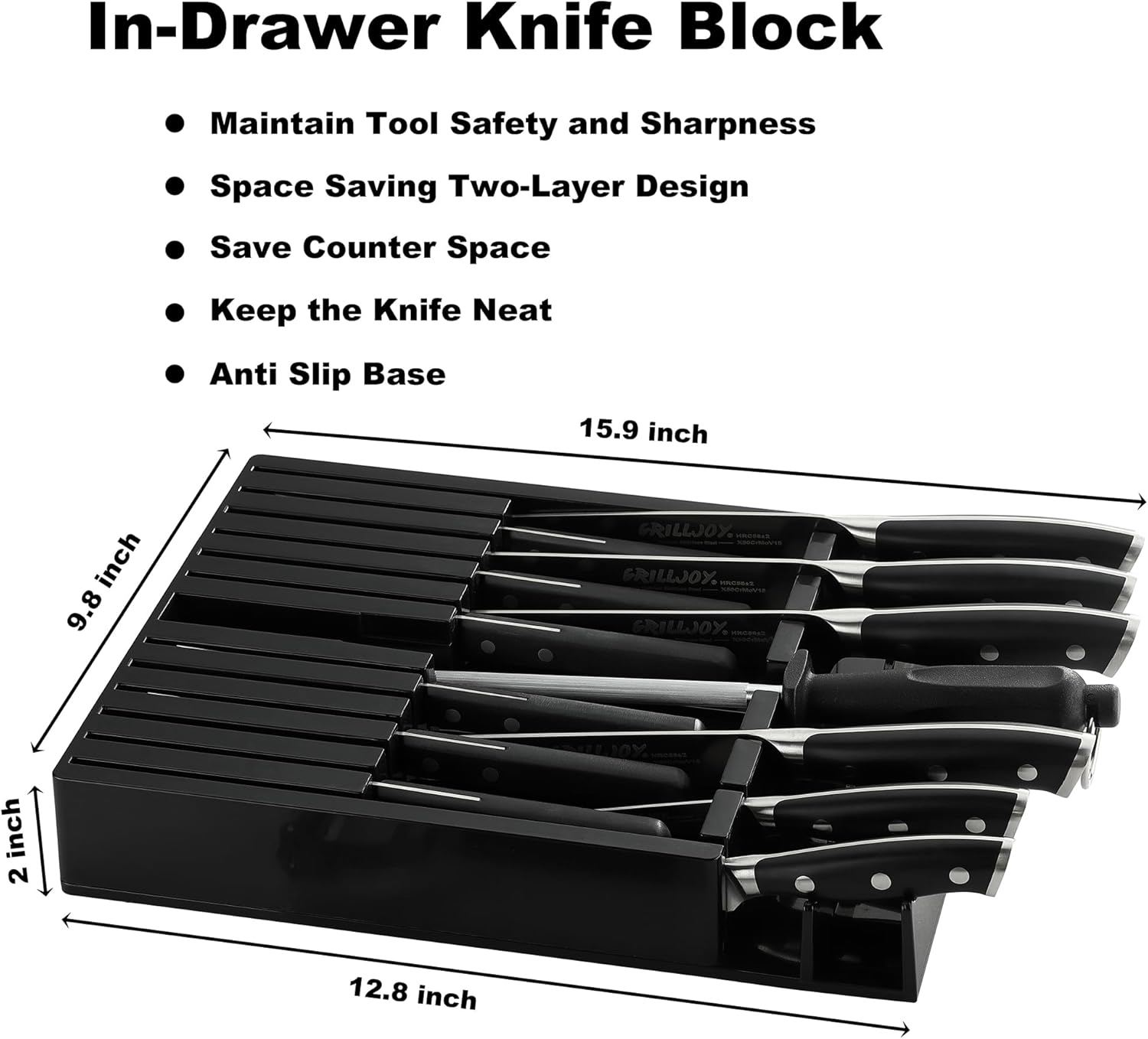 Enhance your kitchen with the Grilljoy kitchen knife set with block. The knives are precision-stamped along their entire length, ensuring their durability.