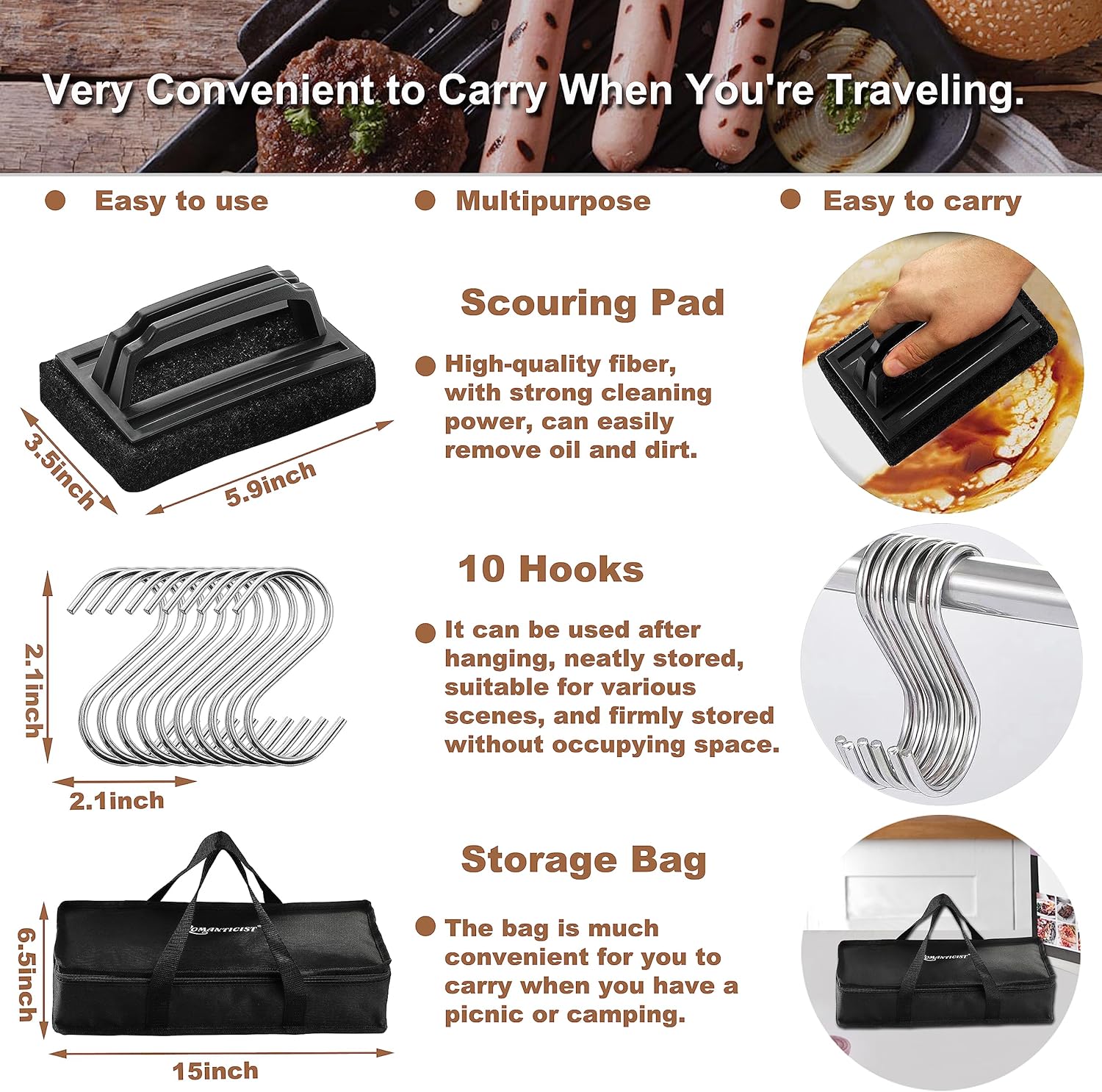 The complete and versatile teppanyaki preparation set, consisting of 25 pieces, will meet all your teppanyaki preparation needs, and you will no longer have to worry about choosing the right tools for preparation. The flipper has a very large surface area, allowing for easy flipping of dishes. The two types of spatulas are perfect for mixing ingredients with oil and sauce or without, and the scraper is for cutting ingredients into cubes and cleaning the griddle. In addition to high-quality kitchen utensils, you will also receive other useful food preparation aids, such as 2 water/oil bottles, 2 spatulas, 2 egg rings, 10 hooks, a sauce brush, tongs, a cleaning brush, a serving knife, and a carrying bag.